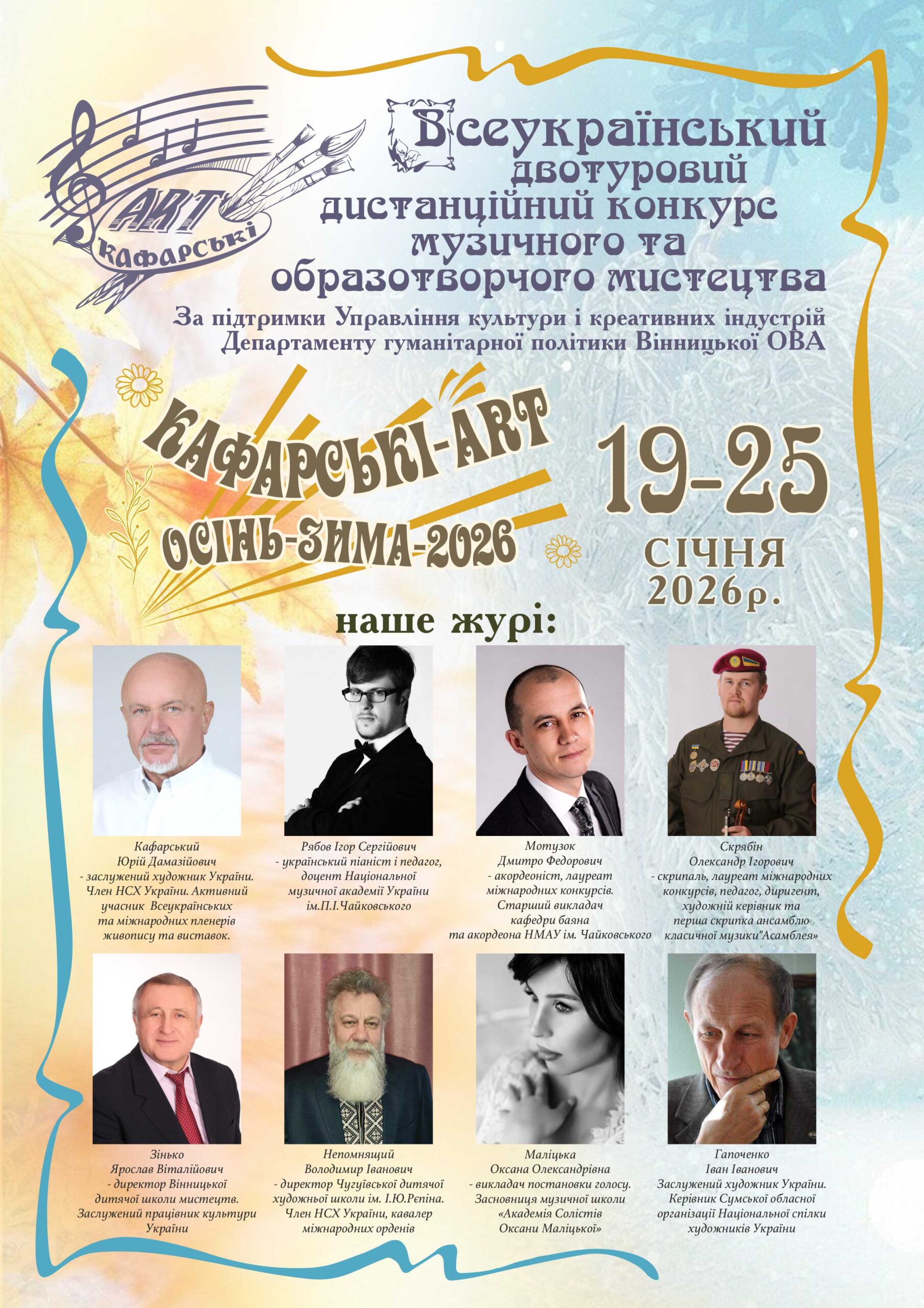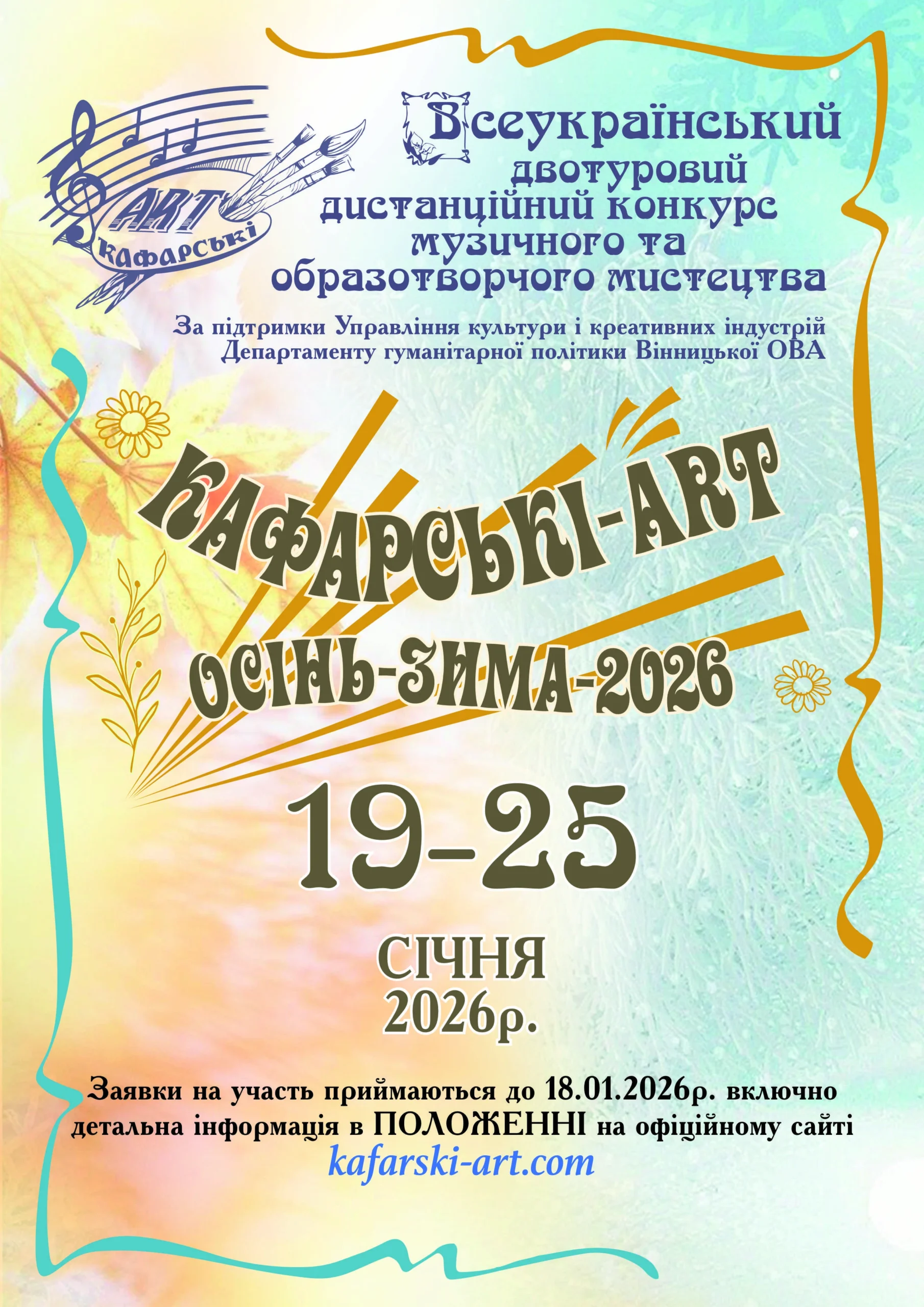 Щиро запрошуємо Вас взяти участь у Всеукраїнському двотуровому дистанційному конкурсі музичного та художнього мистецтва «Кафарські-ART-Осінь-Зима 2026» з 19 по 25 січня 2026 року за підтримки Управління культури і креативних індустрій Департаменту гуманітарної політики Вінницької ОВА.